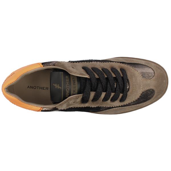 Stunning Another Trend Trainers, model A032. These ladies trainers showcase a stylish and unique combination of brown suede and metallic with a vibrant pop of orange at the heel. Designed for comfort and everyday wear, they feature a lightweight, supportive sole and a padded insole to keep your feet cushioned all day. Perfect for those who want to blend fashion with practicality, these trainers are versatile enough for running errands, weekend adventures, or adding a sporty-chic touch to your everyday look.