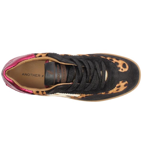 Step into stylish comfort with these Ladies Trainers from Another Trend shoes, model A032, showcases a stylish combination of black suede leather, leopard print and a pink heel cap. This trendy design is complemented by a cushioned insole for added comfort and a gum outsole for durability. Perfect for pairing with outfits, this trainer offers both fashion and function.