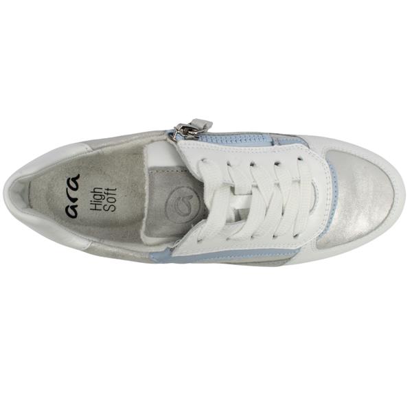 These ladies trainers from Ara shoes are a comfortable and stylish addition to your wardrobe. Featuring a white upper with shimmering silver deatiling, this stylish shoe combines fashion with practicality. The lace and zip closure provides a secure and adjustable fit.The Ara shoes High Soft insole ensures superior cushioning and all day comfort.