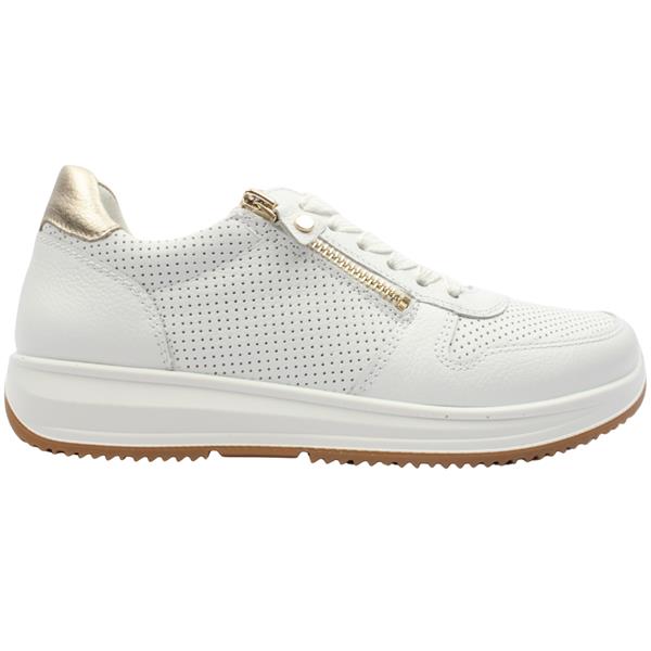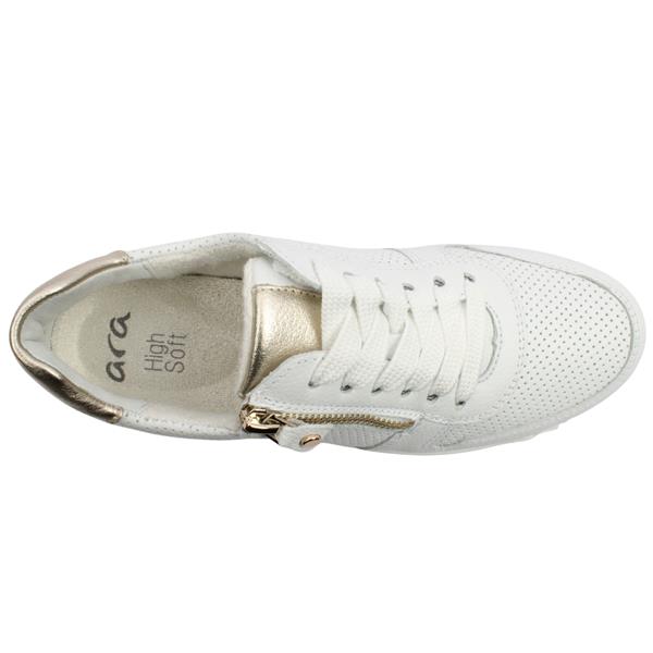 Step out in style with womens trainers from Ara shoes. Crafted with a sleek white leather upper, they feature a subtle gold heel cap for a touch of elegance. The combination of lace and zip closures ensures a perfect fit while the Ara High Soft insole provides exceptional cushioning for all day comfort. Finished with a slight heel for a flattering lift, these trainers seamlessly blend sporty style with everyday sophistication.