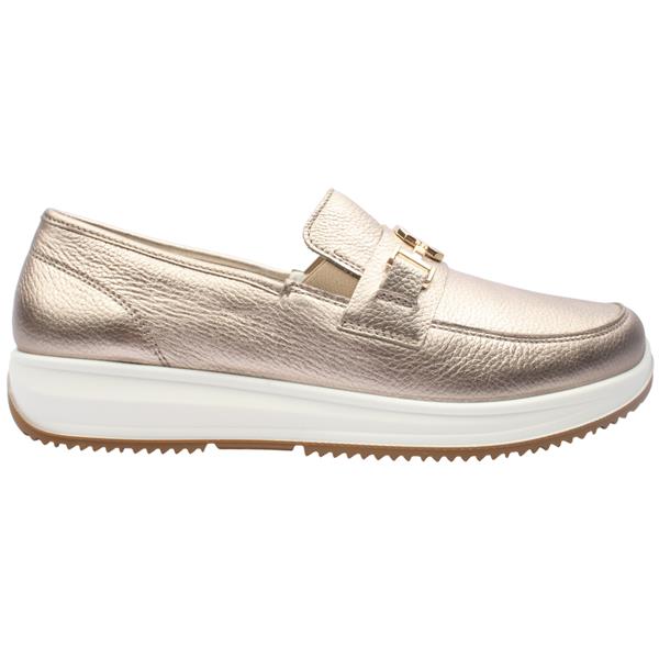 Stylish ladies wide fitting shoes from Ara Shoes. These ladies slip on shoes have a metallic leather upper, adorned with a stylish chain detail on the front. These shoes are a H Wide fitting, ensuring optimal comfort and width. Perfect for everyday casual attire, they offer both style and practicality.
