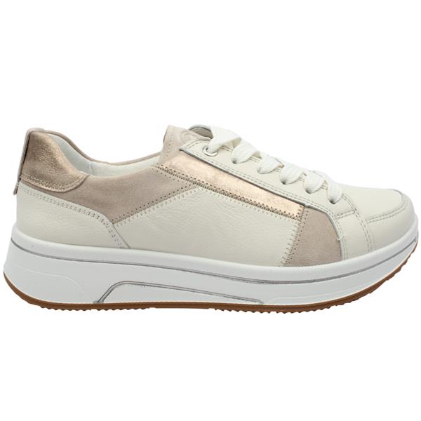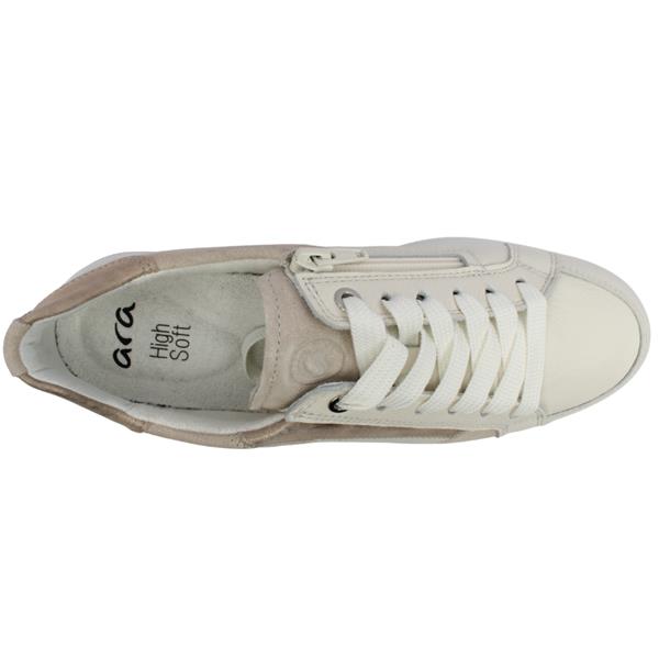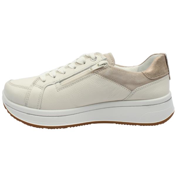 These wide fitting ladies trainers from Ara Shoes in a neutral cream upper are a stylish & versatile addition to your wardrobe. The Ara Sapporo shoes are designed for those seeking comfort and extra width from their shoes thanks to the H Wide Fit design. The combination of lace and zip closure provides a secure and adjustable fit. Inside the Ara Shoes High Soft insole ensures superior cushioning and all day comfort. This insole can be removed to allow for a custom orthotic if needed. Inside, the shoe features an innovative bamboo based lining, which is breathable, moisture absorbing, and naturally soft against the skin, helping to keep feet feeling fresh and comfortable throughout the day.