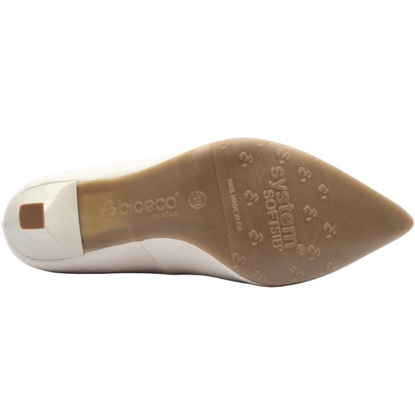 Elevate your style with these classic womens court shoes from Bioeco shoes. Made from high quality, beige patent leather with a subtle gold detail on the front to add a touch of luxury to this classic silhouette. The "V" shape at the front enhances the shoes shape and elongates the leg. Incorporating the Bioeco By Arka soft step system and G wide fit, these shoes provide exceptional comfort and support so you can wear them all day with ease. The medium heel height offers the perfect balance of height and stability making them ideal for special and professional occasions.