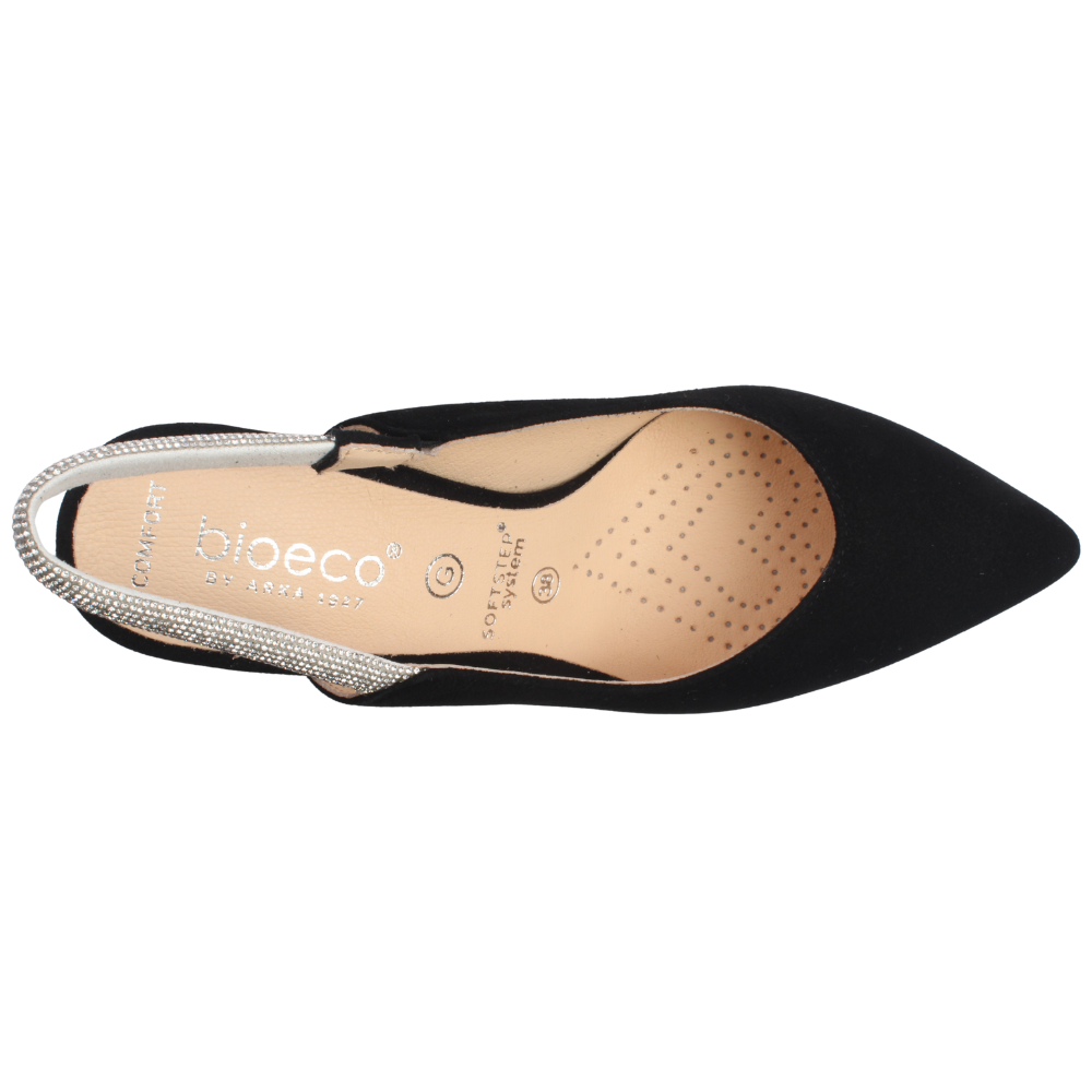 Step into classic sophistication with the Bioeco By Arka ladies high heels, designed for both style and comfort. Crafted with a black suede leather upper, these heels exude elegance, making them the perfect choice for any special occasion. The diamante encrusted slingback strap adds a touch of glamour. Featuring a 7cm heel, these shoes offer the perfect balance of height and wearability, elongating your silhouette without compromising on comfort. Thanks to the innovative SoftStep system, you'll experience superior cushioning and support, allowing you to stay stylish and comfortable all day long.