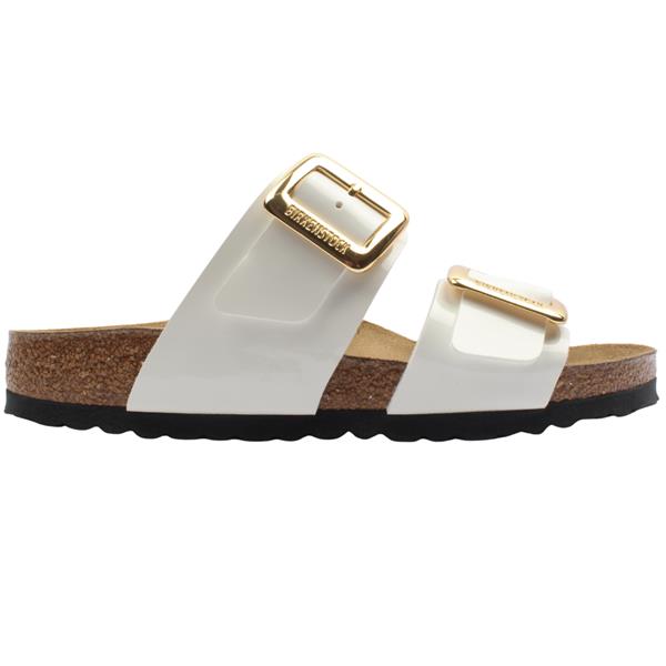 Brand: Birkenstock Style: Sydney Cushion Buckle 1029438 Colour: White Patent Fit: Narrow Heel Height: Approx 3.5cm Closure: Slip On Materials: Synthetic upper, leather/textile lining & manmade sole