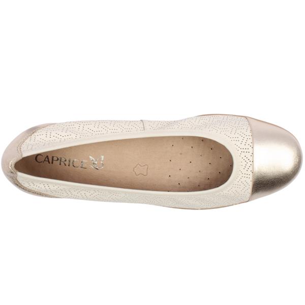 Ladies slip on pumps from Caprice shoes. This shoe has a punched cream leather upper with an elasticated topline which allows for easy on and off while keeping the foot secure. The gold patent toe and heel cap adds to the appeal of the shoe. The shoe has a removable leather insole. This shoe is also a G width.