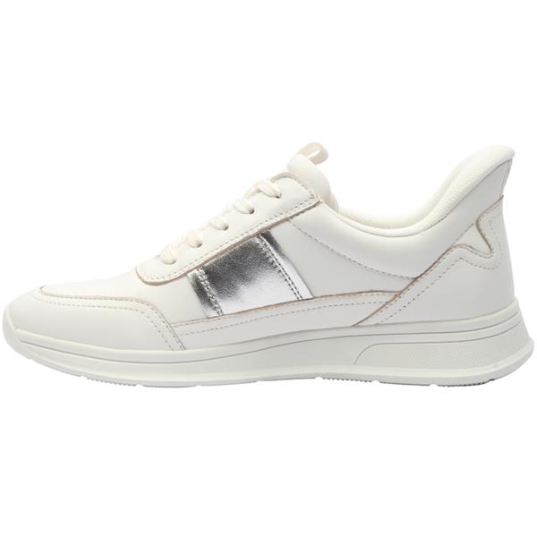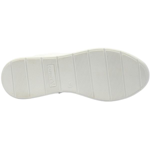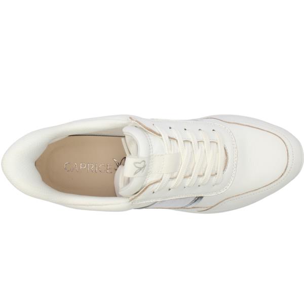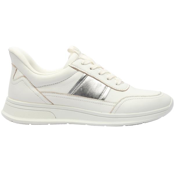 Ladies wide fitting trainers from Caprice Shoes in a white leather upper with silver detailing. These shoes have a lace closure and a removable insole which both allow for a customisable fit.These shoes are a wide G width fitting, ensuring optimal comfort. Perfect for everyday casual attire, they offer both style and practicality.