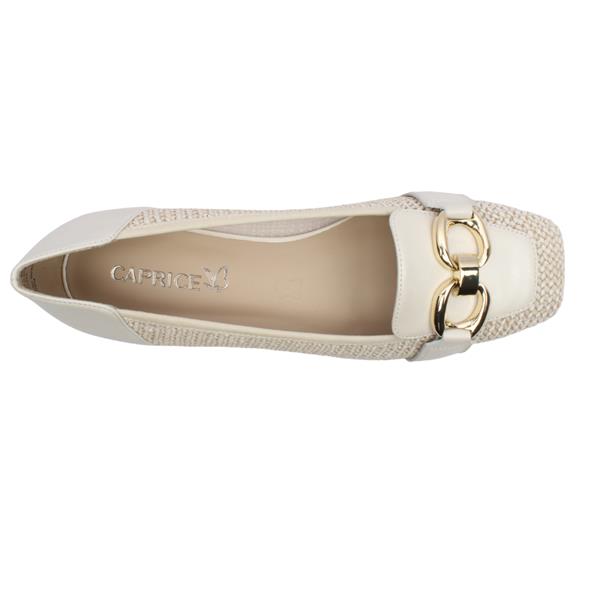 Ladies slip on pumps from Caprice shoes. Designed with a refined blend of textures, these pomps feature a leather and tweed-effect upper that adds depth and sophistication to a classic silhouette.A silver brooch detail at the front provides a subtle, eye-catching accent, making them ideal for both work and occasion wear. Inside, a leather insole ensures a comfortable feel throughout the day, offering a smooth and breathable fit. Finished in a timeless ice white tone, these Caprice pumps are a versatile choice that pairs effortlessly with jeans, tailored outfits or elegant dresses.