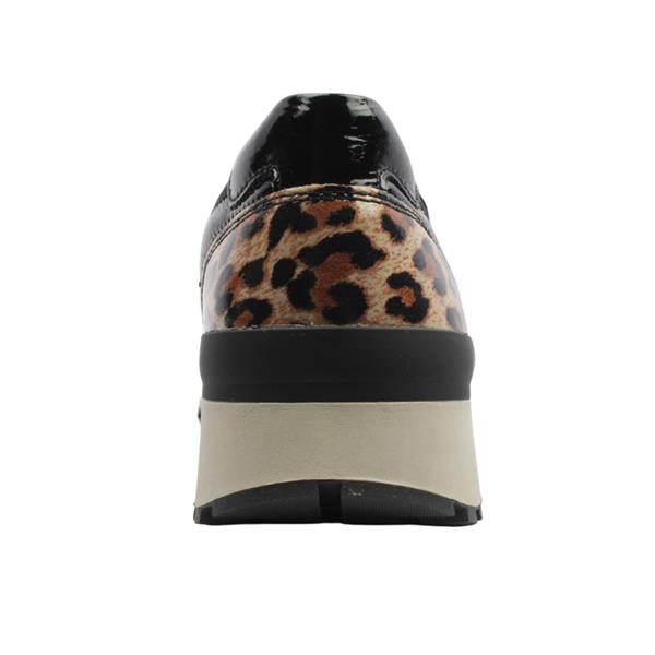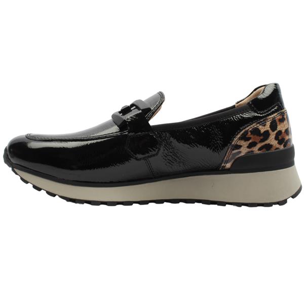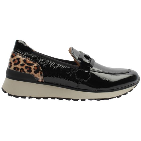 Introducing the effortlessly chic, wide fitting loafers from Caprice Shoes. Crafted with a black patent leather upper this shoe exudes understated elegance. The appeal of the shoe is enhanced by a sleek chain detail adorning the front and a subtle pop of leopard print at the heel. Designed for both style and comfort, its elasticated topline guarantees a secure fit with every step. They are a G wide fit.