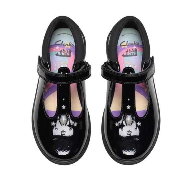 Black girls School Shoes from Clarks shoes with a unicorn/mermaid design on the sole. These girls Mary Jane Shoes are crafted with super soft patent leather upper and have a bouncy foam footbed for all day comfort. Designed with a velcro strap that little ones can open and close all by themselves. Featuring Clarks Microban odour control lining which keeps shoes feeling fresh. The flex-grooved, non-marking grippy rubber sole bends with natural foot motion