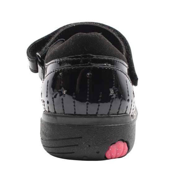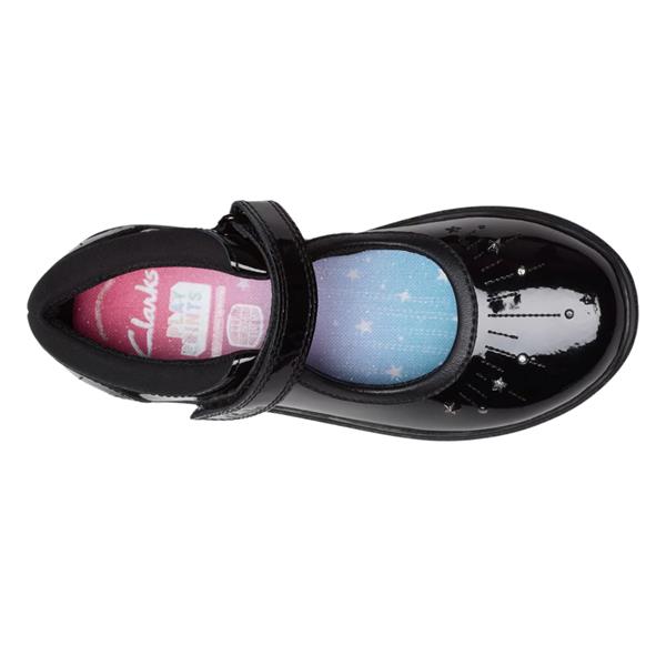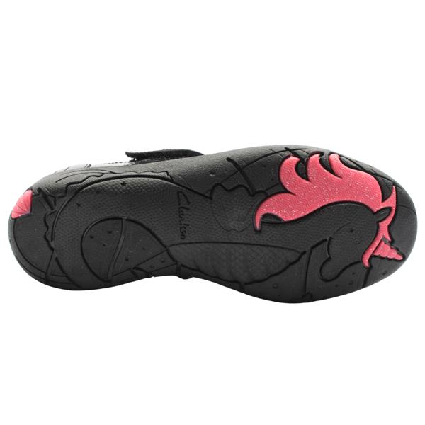 Black girls School Shoes from Clarks shoes. Clarks Relda Wish K is a magical unicorn inspired shoe with fun ombre insole and hot pink colour pops on the sole. Crafted with super soft patent leather upper and have a bouncy foam footbed for all day comfort. Designed with a velcro strap that little ones can open and close all by themselves. Featuring Clarks Microban odour control lining which keeps shoes feeling fresh. The flex-grooved, non-marking grippy rubber sole bends with natural foot motion