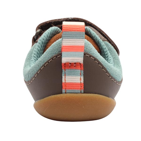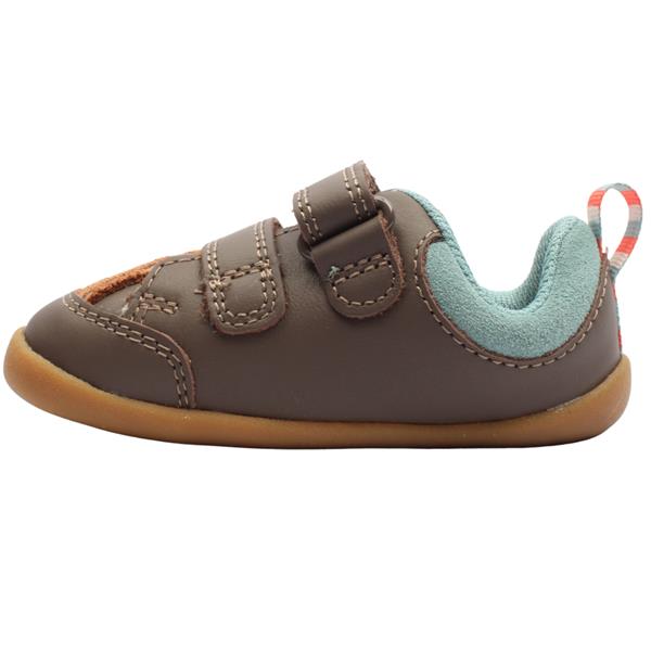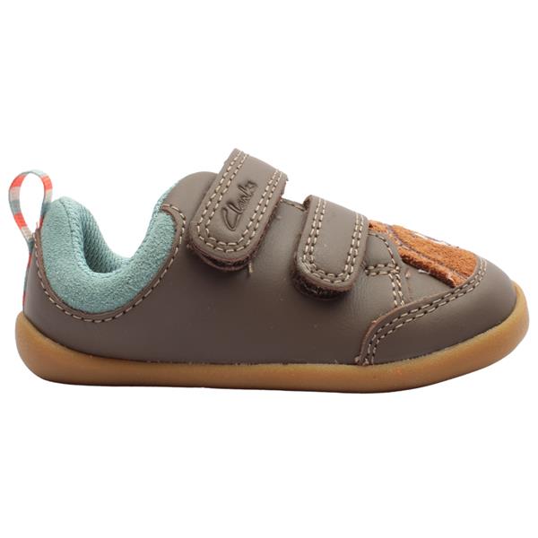 Clarks Shoes Roamer Eden T is a cute and supportive choice for little ones first steps. Featuring a sweet bear motif to the front. Double velcro straps make these easy to put on/off while keeping the shoe secure on the foot. The Padded collar and tongue add comfort and support. A Flex-grooved rubber sole enhances natural foot motion and wraps at the toe for added protection for those all important first steps.