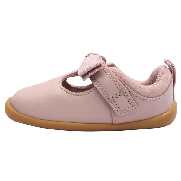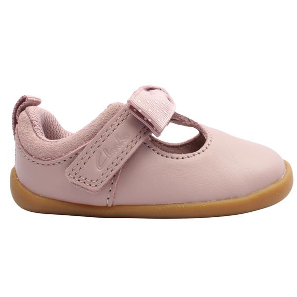 Brand: Clarks Style: Roamer Trim T Colour: Dusky Pink Width: F Closure: Velcro Strap Materials: Leather Upper, leather/textile lining & manmade sole