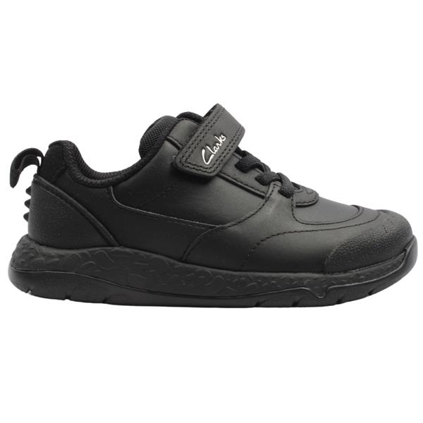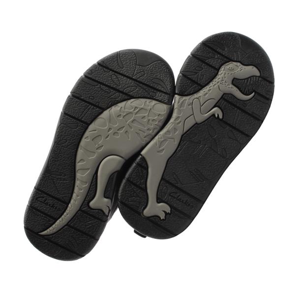 Black boys School Shoes from Clarks shoes. This chunky trainer style shoe has 3D Dino spine details to the heel and dinosaur motifs decorating the flexible rubber outsole. The padding to the tongue and collar keeps little feet feeling comfy all-day long.Elastic lace and velcro closure offer easy on/off and a secure fit. Featuring Clarks Microban odour control lining which keeps shoes feeling fresh. The flex-grooved grippy rubber sole bends with natural foot motion. Rubber toe bumpers protects little feet.