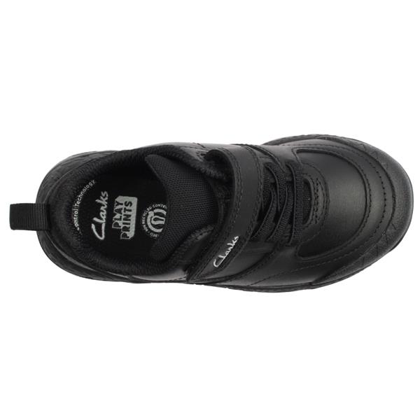 Brand: Clarks Style: Steggy Stride K Colour: Black Leather Width: G (Wide Fitting) Closure:Single Velcro Closure and elastic laces Materials: Leather Upper, Textile Lining, Manmade Outsole