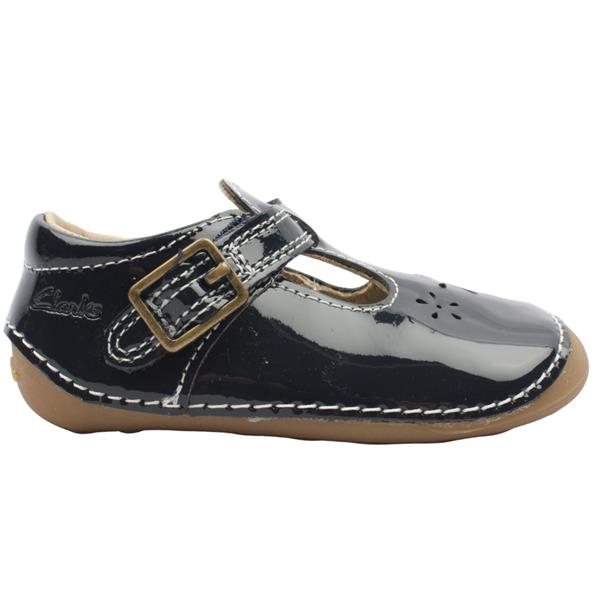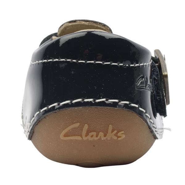 Introduce little feet to confident first steps with girls prewalkers from Clarks shoes. Durable navy patent leather gives a soft shine and smooth feel thats gentle on young feet. Features a Velcro closure with faux buckle detail making them simple for parents to put on and off. The grippy flexible rubber sole is designed to bend with the foot encouraging natural movement. Built to support early milestones these pre walkers offer lightweight stability and support ideal for crawling and cruising.