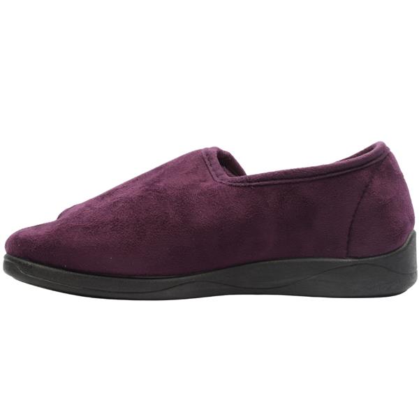 Wide fitting ladies slippers from Cosy Toes slippers. This slipper has a soft purple upper with a velcro strap that opens up wide to allow for easy on and off. A soft lining and a padded insole add to the comfort of these Wide fitting slippers.