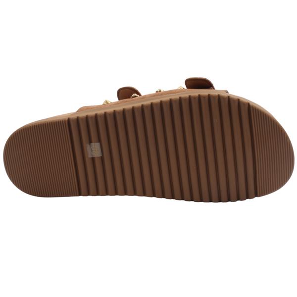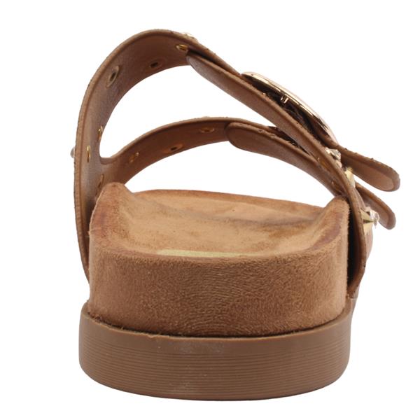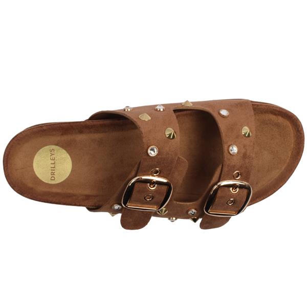 Ladies Sandals from Drilleys Shoes, Ninety Seven. These slip on mules have a soft tan upper with stud & jewel detailing. The soft padded insole will keep you comfortable for all day wear. The buckle closure ensures a secure fit across the instep.