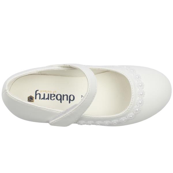 Simple and elegant white Communion shoes for girls from our Dubarry Kids shoes range. This stunning shoe has an adjustable velcro strap across instep which ensures the foot is kept secure at all times. It is designed using a smooth white faux leather upper and has a dainty pearl floral trim detailing. These Girls Communion Shoes feature a modest small heel, they add just the right touch of grace while remaining perfectly suitable for young girls.