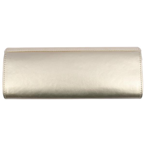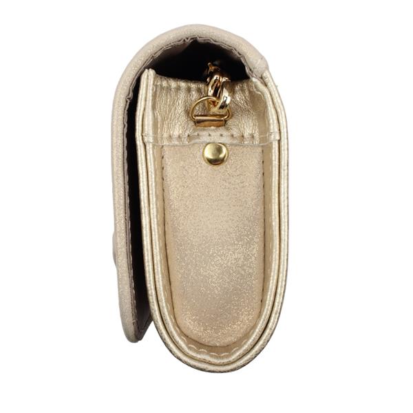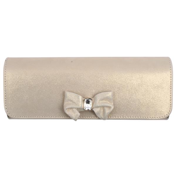 Womens clutch bag from Emis. The front showcases a chic bow design accented with a sparkling gem adding a playful yet elegant touch. A detachable gold chain strap gives you the flexibility to carry it as a clutch or wear it over the shoulder.
