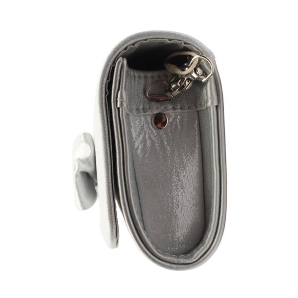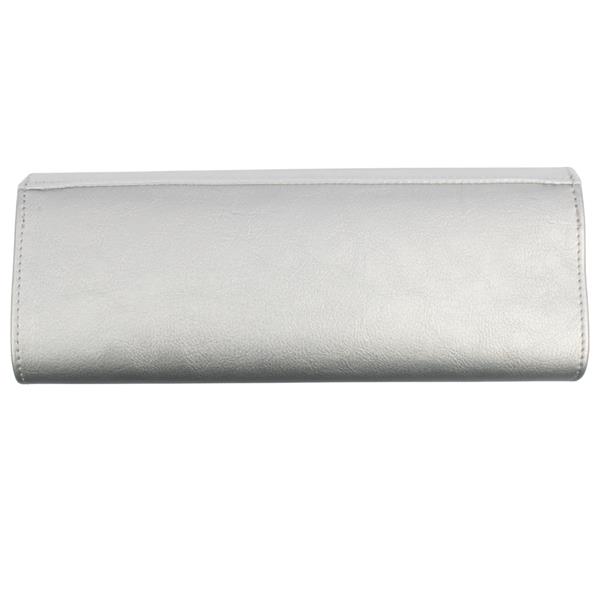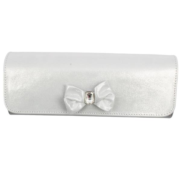 Womens elegant clutch bag from Emis Shoes. The front is adorned with a chic bow design accented with a sparkling gem creating a feminine and glamorous focal point. A detachable silver chain strap offers versatility allowing you to carry it as a clutch or wear it over the shoulder with ease. The perfect finishing touch for your outfit.