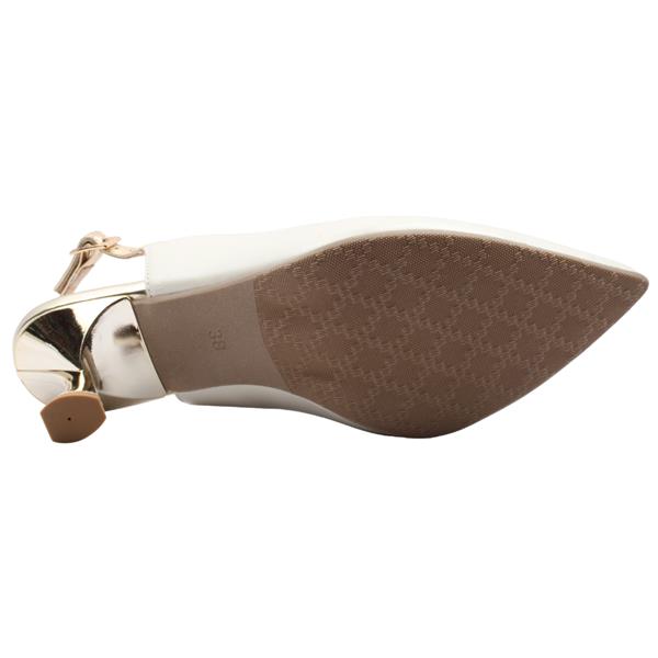 Step out in effortless elegance with the Emis 8414 Ladies Sling Back Court Shoe, designed to bring sophistication and comfort to your everyday style. Crafted in a versatile pearl tone with refined gold detailing, this chic heel adds a subtle touch of glamour to both formal and smart-casual outfits. The sleek pointed toe creates a flattering, elongated silhouette, while the stylish “V†shaped front adds a modern design element that enhances the shoe’s elegant look. A fully adjustable sling back strap ensures a secure and comfortable fit throughout the day. Finished with a durable rubber outsole, which provides extra comfort and stability, making it ideal for long wear.