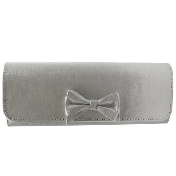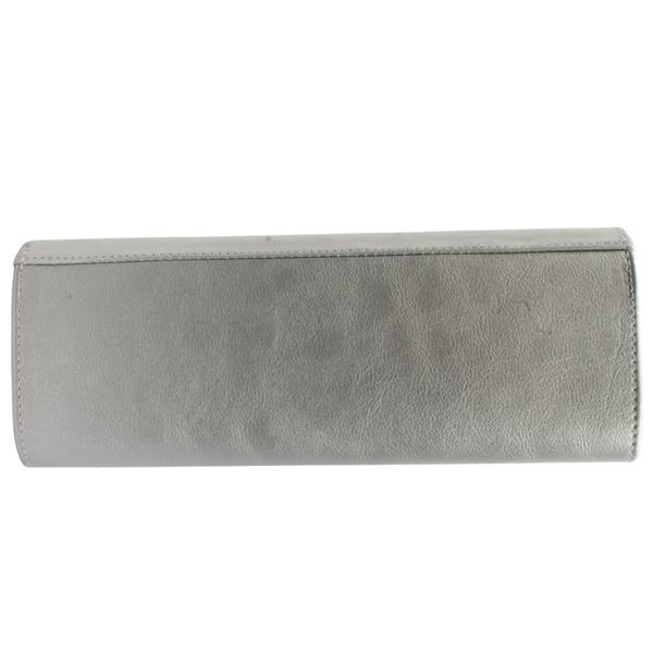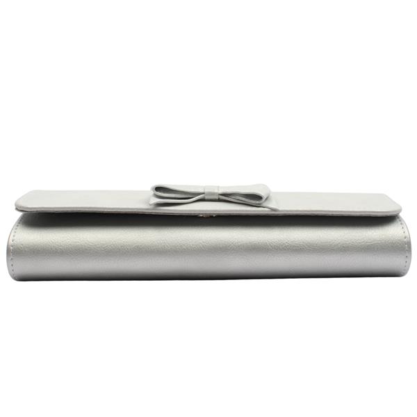 Crafted in a sleek silver finish, this elegant clutch adds a touch of glamour to any special outfit. With a compact yet practical size of 26cm wide and 11cm deep, it offers enough space for your essentials while maintaining a sophisticated, streamlined silhouette. The magnetic closure keeps your belongings secure while allowing easy access, and the detachable silver chain provides versatile carrying options wear it as a clutch or a shoulder bag to suit your style.