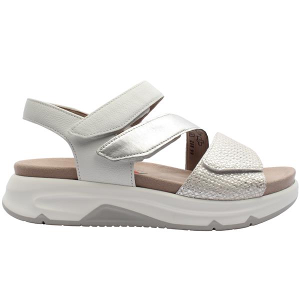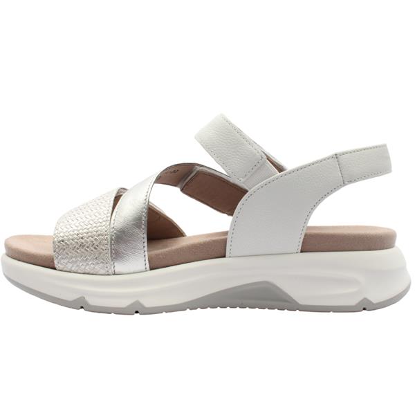 Experience the perfect blend of style and comfort with the Gabor Rolling Soft sandals. Designed for both style and all-day wear, this sandal features a white and silver leather upper. The three adjustable Velcro straps provide a secure, personalized fit, while the removable and washable Velcro insole ensures lasting freshness and convenience.