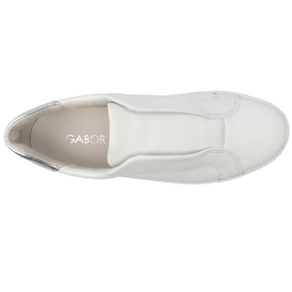 Brand: Gabor Style: 86.391.50 Colour: White/Silver Closure: Slip On Removable Insole: Yes Width: G Wide Fitting Materials: Leather Upper, Removeable Leather Insole, Manmade Sole.