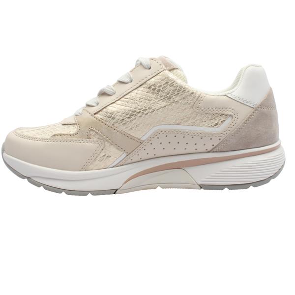 Step into all day comfort with the Gabor Ladies Rolling Soft Runners – 86878. Designed in a sophisticated neutral mix of light gold with subtle croc detailing and soft beige tones, this stylish runner adds an elegant touch to everyday wear. Featuring Gabor shoes innovative Rolling Soft technology, it encourages a smooth, natural walking motion while providing excellent support and cushioning throughout the day. The lace-up fastening combined with a practical side zip offers a secure fit and effortless on-and-off wear. Finished with a removable insole.
