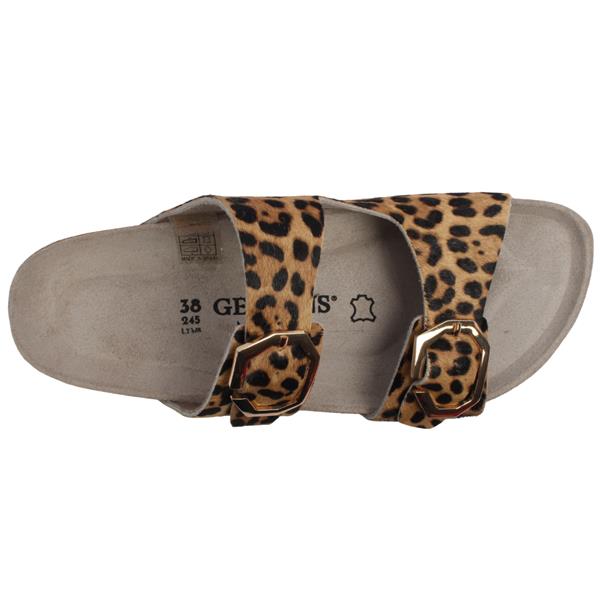 Step into effortless style with these beautifully crafted ladies sandals from Genuins Shoes. Made in Spain, they showcase a bold leopard print design paired with a distinctive hair-textured upper. Designed with both fashion and comfort in mind, the sandals feature a premium leather anatomical footbed that gently supports the natural shape of your foot, ensuring all day wearability. The sleek two-strap design offers a secure fit while maintaining a modern, minimal silhouette.