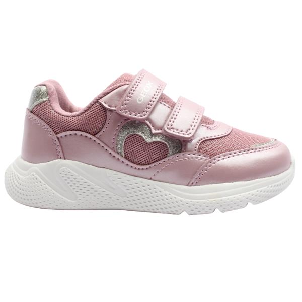 Cute girls runners from Geox Shoes in a rose pink upper with heart design. These shoes feature a convenient double velcro strap closure for easy on and off while keeping the shoe secure on the foot. Geox has crafted these shoes with perforated rubber soles and a membrane designed to absorb and expel sweat while preventing water from entering. The removable insole features a handy check your feet size guide which ensures a perfect fit, allowing you to monitor your childs growing feet with ease & accuracy.