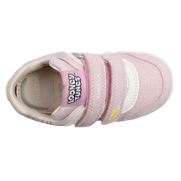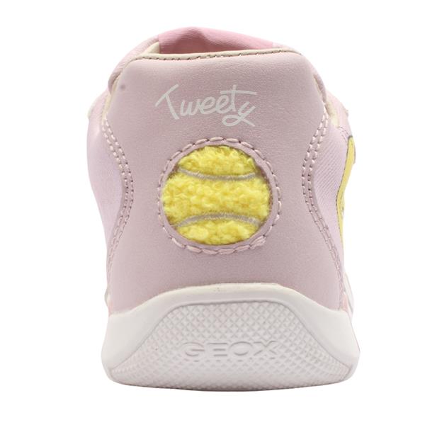 Adorable girls shoes from the Geox Shoes Looney Tunes range with a cute Tweety Bird design. This shoe is equipped with a removable leather insole that is antibacterial. Featuring a handy fit guide at the toe on the insole that ensures the perfect fit and allows to watch your childs growth. Super soft heel cushioning & toe protectors adds to the comfort of the shoe. The double velcro strap allows for easy on/off and keeps the shoe secure on the foot. These shoes are lightweight and breathable, the ideal shoes for their first adventures.