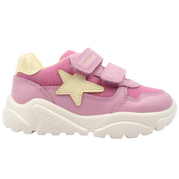 Lightweight girls runners from Geox shoes in a pretty pink upper with yellow shooting star design. The mesh panels ensures breathability, keeping feet cool and comfortable during playtime. The velcro straps make them an easy style to put on/off and ensure a secure fit, perfect for busy little ones.The removable insole features a handy fit guide at the toe which ensures the perfect fit for your little one and allows you to monitor your childs growing feet with ease & accuracy