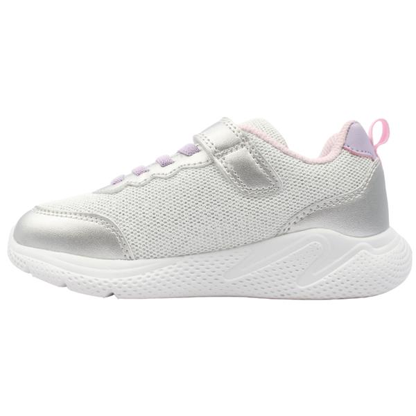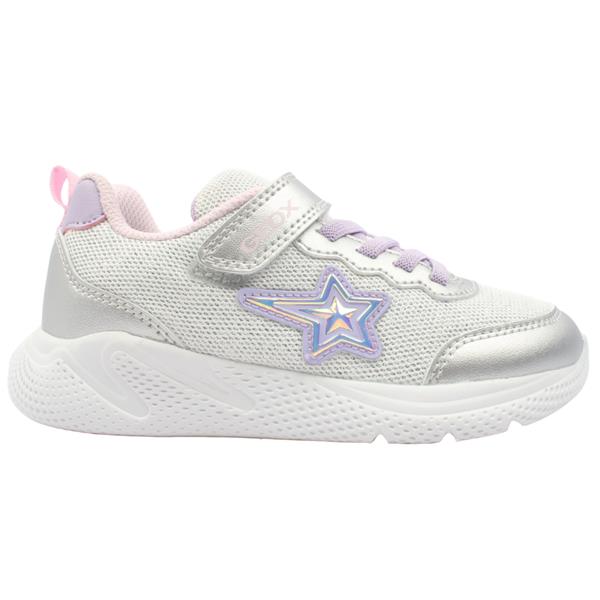 Lightweight girls runners from Geox shoes in a sparley silver upper with shooting star design. The mesh upper ensures breathability, keeping feet cool and comfortable during playtime. The elasticated lace and a Velcro strap make them an easy style to put on/off and ensure a secure fit, perfect for busy little ones.