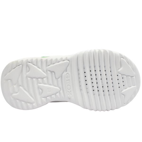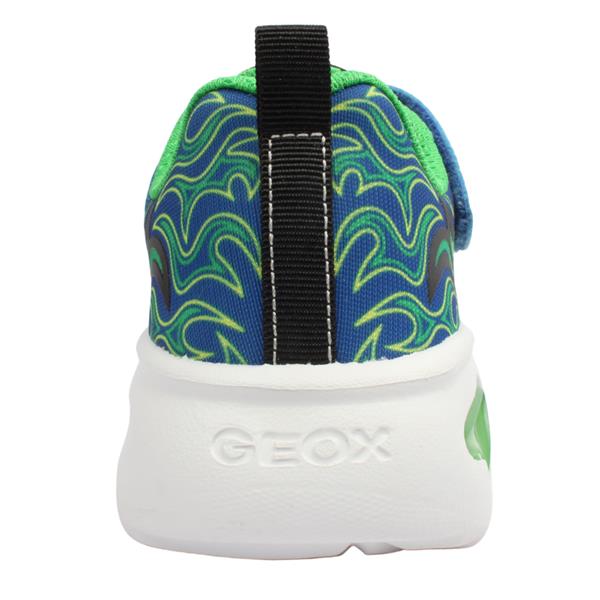 Step into comfort and fun with these sporty Geox boys runners, J56DZB in a bold blue and green mix. Designed for everyday wear, they feature elastic laces and a single Velcro strap for an easy, secure fit that kids can manage themselves. The outsole comes with built-in flashing lights for a playful touch, complete with an on/off button at the side so they can shine whenever they choose. A removable insole ensures comfort, breathability, and easy cleaning, while Geoxs signature technology helps keep little feet fresh all day long.
