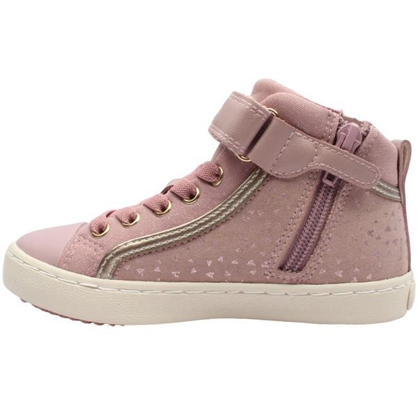 Hi top girls boot from the Geox shoes. This boot has a pink glitter upper with cute bow detail. The boot has a soft and light upper with a flexible non slip sole. The boot has a rubber toe cap for added protection. A Leather removable insole for added comfort. It has an side zip, a single velcro strap and elasticated laces for easy on & off.