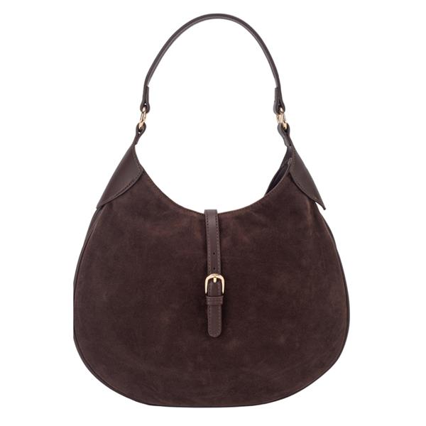 The Gionni Curved Hobo Handbag, 11G2795 in Dark Brown, blends modern elegance with everyday practicality. Crafted from soft suedette material, its chic curved silhouette is complemented by gold-tone hardware and a comfortable shoulder strap.