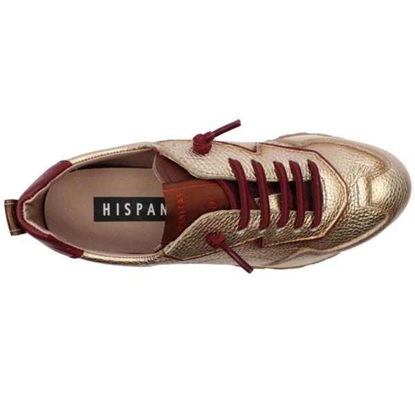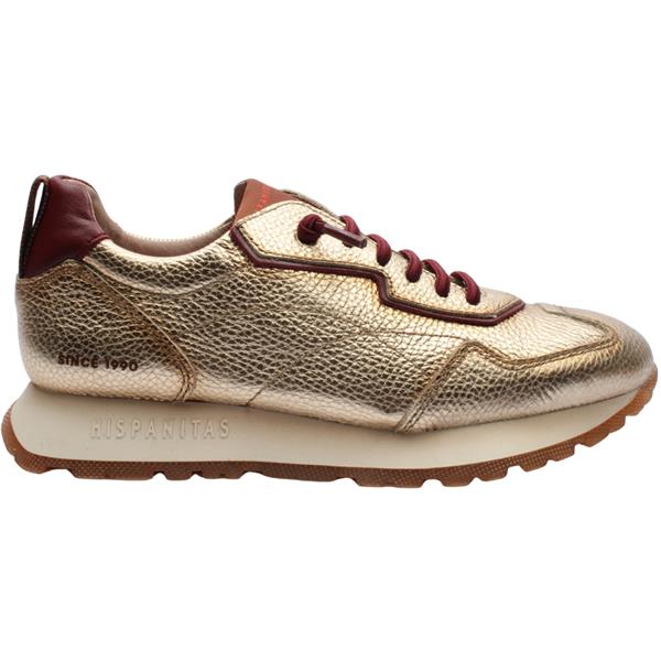 Modern comfort meets standout design in this eye catching womens shoe from Hispanitas. Crafted with a luxurious gold leather upper and rich burgundy accents, it offers a bold yet elegant look. The elasticated lace provides easy slip-on wear, while an additional taupe lace is included for versatile styling. Set on a chunky sole with Hispanitas' signature Triflow technology, this shoe delivers exceptional cushioning, flexibility, and shock absorption with every step.