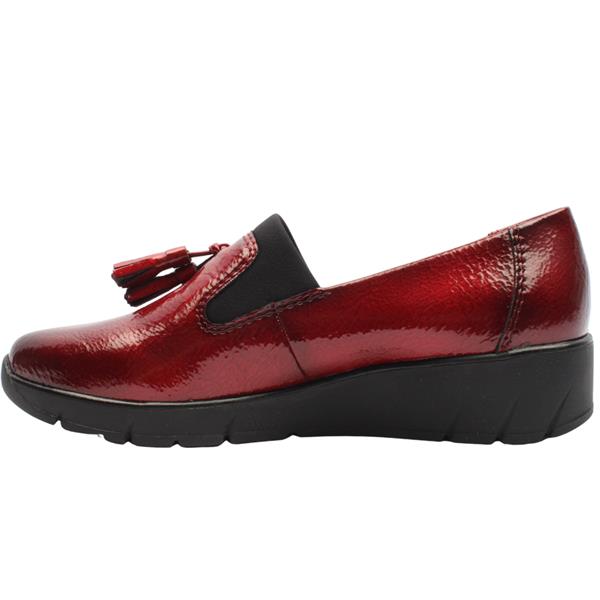 A classic trouser shoes from Jana Shoes in a vibrant red patent upper. These slip on shoes are equipped with elasticated side gussets which make them easy put on/off. Featuring a subtly elevated wedge heel for a touch of height, this shoe blends fashion and function. Inside, the Jana Soft Line insole cushions every step, and the Soft Flex sole ensures smooth, natural movement.