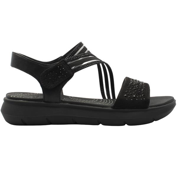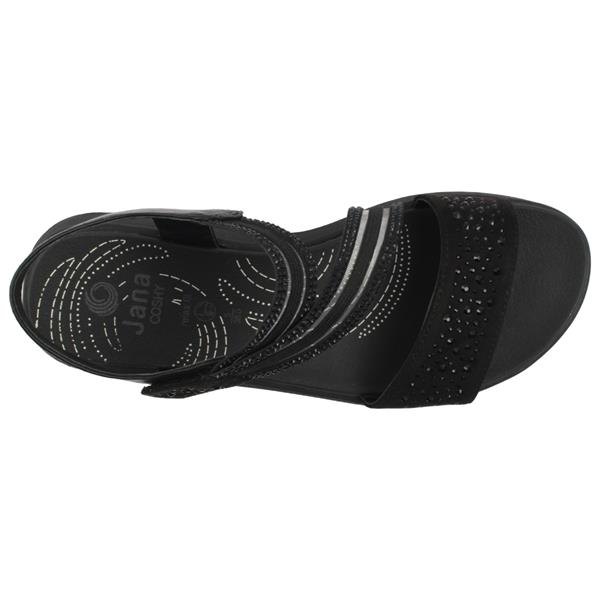 Womens comfortable sandals from Jana shoes. The black upper is lifted with diamante detailing adding just the right amount of sparkle. A Velcro closure lets you tailor the fit quickly and easily. The Jana Coshy insole delivers soft cushioning underfoot so every step feels relaxed. These sandals are crafted with an H width fitting offering a roomier fit.