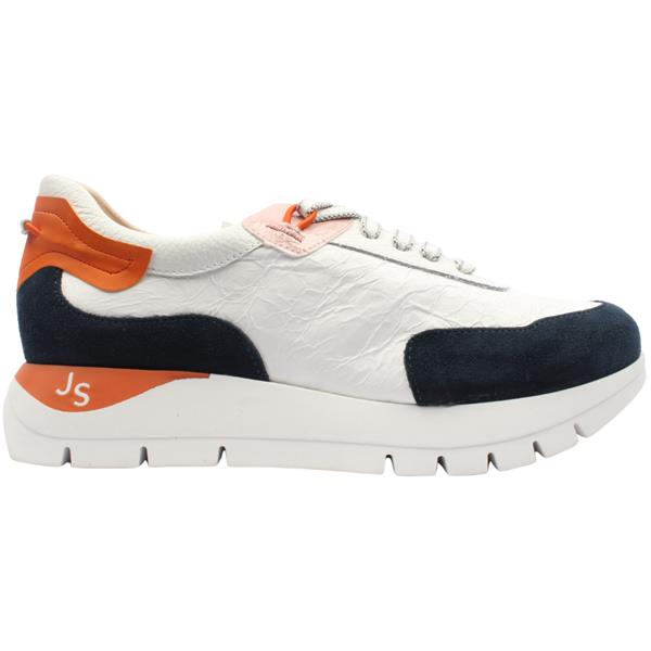 The Jose Saenz Shoes 2287 is a standout style that blends expert Spanish craftsmanship with bold, modern styling. This design showcases a premium distressed, crinkled white leather upper that gives each pair a unique, lived in character. Contrasting navy suede panels add depth and texture, while vibrant orange leather detailing injects a fresh pop of color for a contemporary edge. The classic lace closure ensures a secure, adjustable fit, making it as practical as it is stylish.