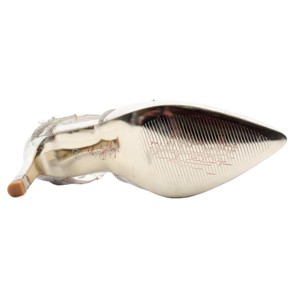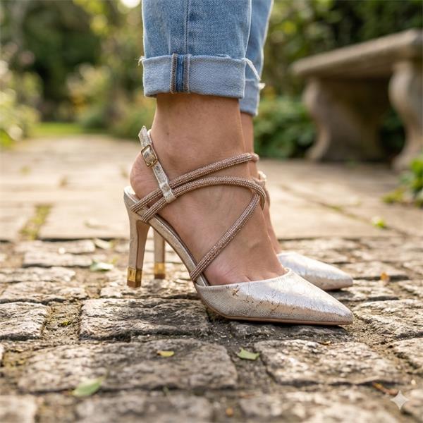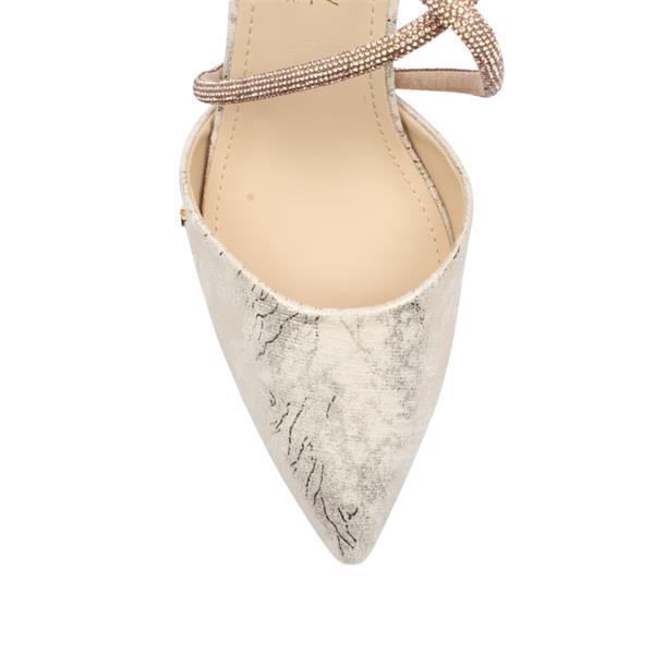 Add a touch of sparkle to your occasion wardrobe with these elegant Ladies dressy shoes from Kate Appleby Shoes. Designed to stand out, it features a beautiful gold patterned upper that catches the light and adds subtle texture to your look. The sleek pointed toe creates a refined, feminine silhouette, while the silver diamante straps across the foot bring a glamorous finish that is perfect for weddings, parties, and special events. An adjustable slingback strap provides a secure and comfortable fit while maintaining the shoe’s elegant profile.