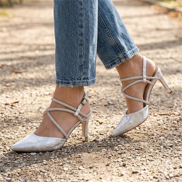Add a touch of sparkle to your occasion wardrobe with this elegant Ladies dressy shoe from Kate Appleby Shoes. Designed to stand out, it features a beautiful silver patterned upper that catches the light and adds subtle texture to your look. The sleek pointed toe creates a refined, feminine silhouette, while the silver diamante straps across the foot bring a glamorous finish that is perfect for weddings, parties, and special events. An adjustable slingback strap provides a secure and comfortable fit while maintaining the shoe’s elegant profile.