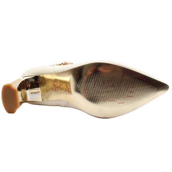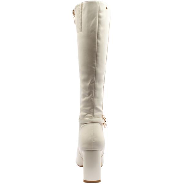 Ladies Kneehigh boots from Kate Appleby shoes, designed to blend elegance with contemporary flair. Crafted in a neutral almond finish, these boots feature a sleek pointed toe and a striking high shaped heel with a metallic gold insert for a touch of glamour. The standout detail is the chic gold-toned chain-link embellishment around the ankle, adding sophistication and eye-catching appeal. Perfect for elevating day-to-night outfits, these boots pair effortlessly with dresses, skirts, or skinny jeans for a polished and confident look.