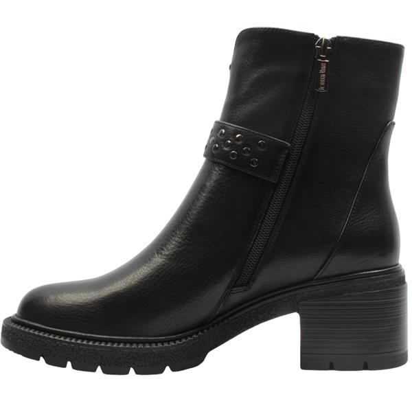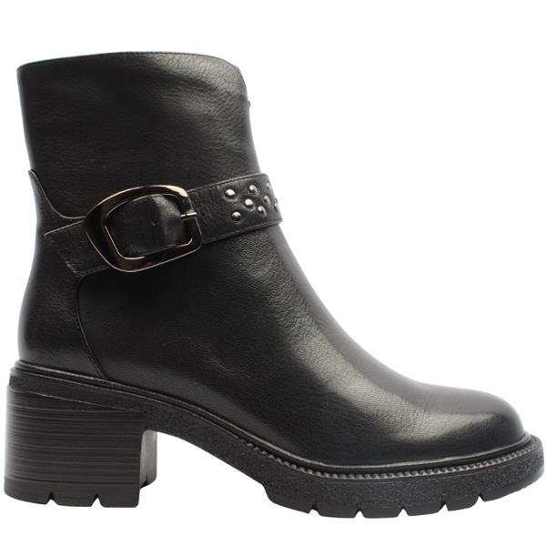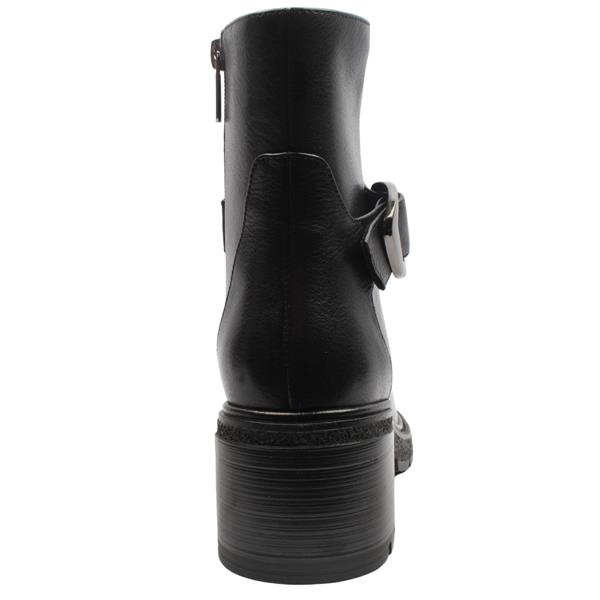 Step into style and comfort with these chunky Loretta Vitale ankle boots -C1504. Designed with a sleek black finish, bold buckle strap, and subtle stud detailing, they add a touch of edge to any outfit. The sturdy block heel and rugged sole provide all-day comfort and support, making them perfect for both casual and dressy looks. The side zip ensures easy on/off.