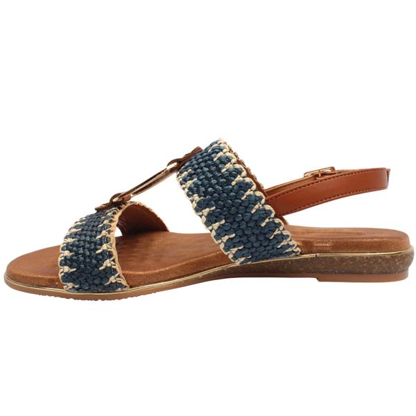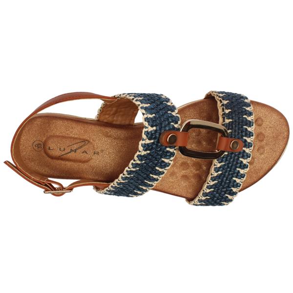 Step into summer style with the Jules Sandals from Lunar Shoes. Featuring woven straps in a versatile navy upper with a gold link detail, this sandal blends relaxed charm with an elegant style. A padded insole and adjustable buckle strap keep comfort at the forefront, making it the perfect choice for sunny strolls, casual days, or evening getaways.