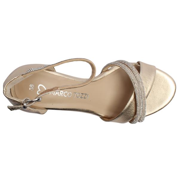 Add a touch of glamour to your wardrobe with this stunning gold heeled sandal from Marco Tozzi shoes. Featuring a shimmering gold upper, the front boasts a stylish criss-cross strap design. A closed heel and secure ankle strap with matching diamanté buckle provide both style and support. Finished with a comfortable block heel, this sandal is perfect for special occasions.
