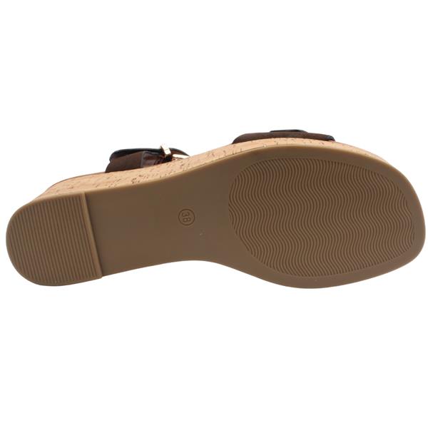 The Marco Tozzi Ladies Wedge Sandal, 28389 is a stylish sandal designed to blend comfort with a subtle statement finish. Finished in a brown faux suede, the sandal features two adjustable gold buckle closures that allow for a secure and personalised fit across the foot. A cushioned insole enhances comfort for all-day wear, providing soft support with each step. The design is set on a cork-effect wedge outsole, giving it a natural, summery look while offering added height and stability compared to a flat sandal. This sandal pairs easily with dresses, linen trousers, or casual summer outfits, making it a versatile addition to warm-weather wardrobes. Brand: Marco Tozzi Style: 28389-44 Colour: Brown Closure: Closure : 2 adjustable buckles Heel Height: Approx 7cm Removable Insole: No Materials: All Manmade