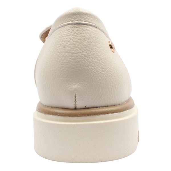 Casual Ladies loafers from Patrizio Como Shoes, style Surinam One. These ladies loafers have a versatile cream upper with a gold brooch across the front of the shoe. A great style for jeans or an office look paired with tailored trousers.